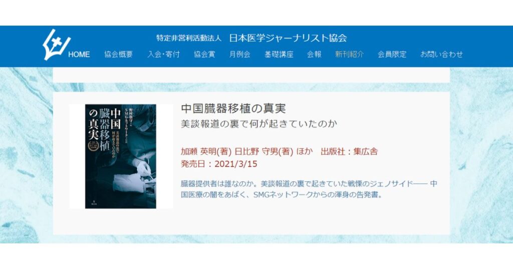 日本医学ジャーナリスト協会の「新刊紹介」に「中国臓器移植の真実」が掲載されました。