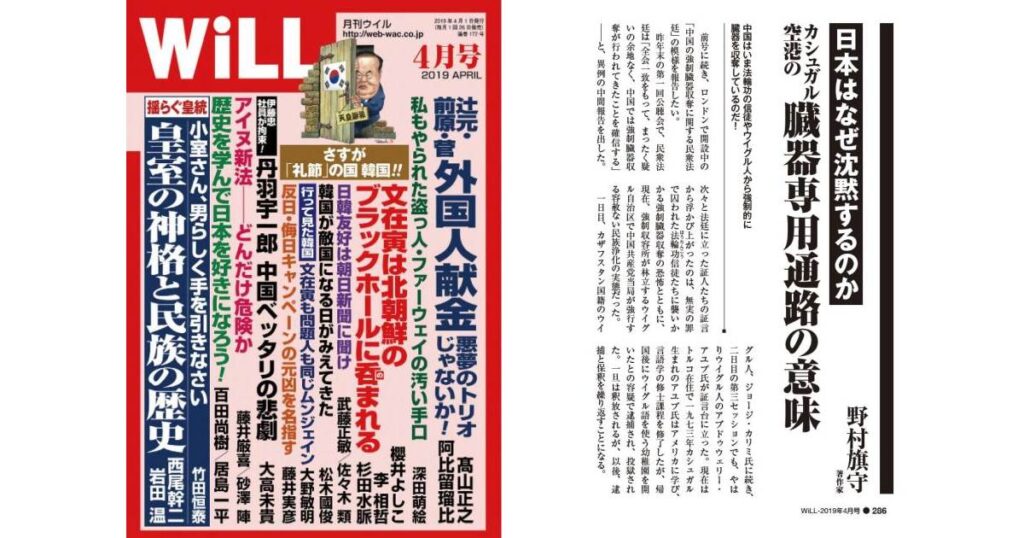 月刊WiLL-2019年4月号:「日本はなぜ沈黙するのか、カシュガル空港の臓器専用通路の意味」(野村旗守)