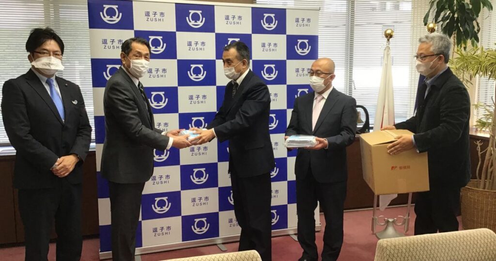 神奈川県逗子市の桐ヶ谷覚市長に対し、コロナ対策用マスク1000枚を寄贈させていただきました